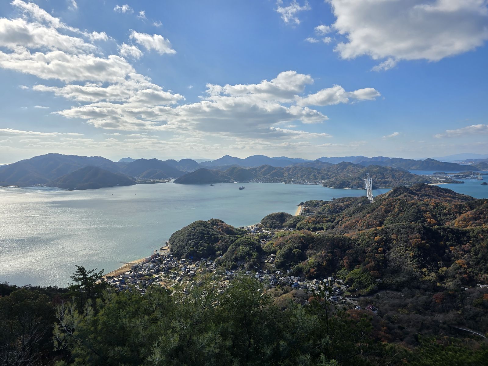 尾道市向島町にある高見山展望台。標高283mの高見山の山頂にあり、しまなみ海道の島々を一望することができます。朝、昼、夕とそれぞれ違う景色を楽しむことができる、しまなみ海道でも指折りのパノラマビュースポットです。